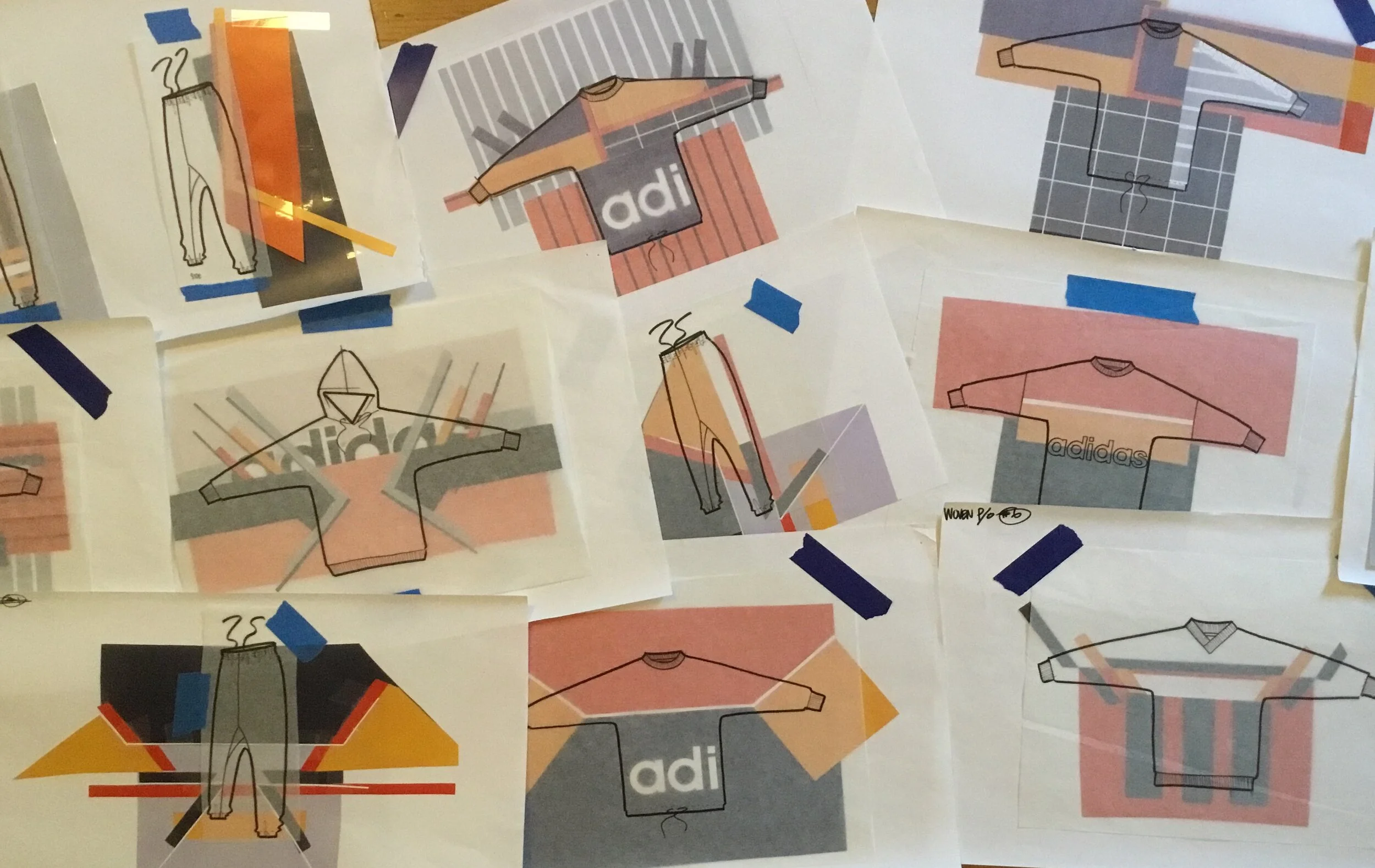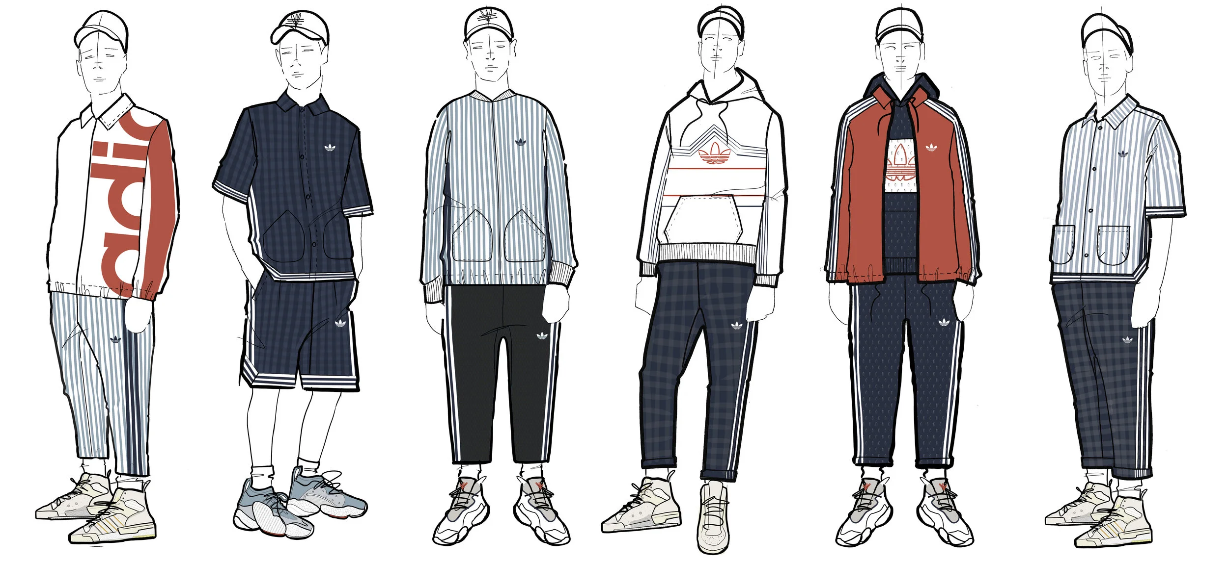 Process for the Adidas Originals SS19 Men's collection: sport + vintage reworks informed new cutlines, graphics, and colors- juxtaposed with classic menswear materials.